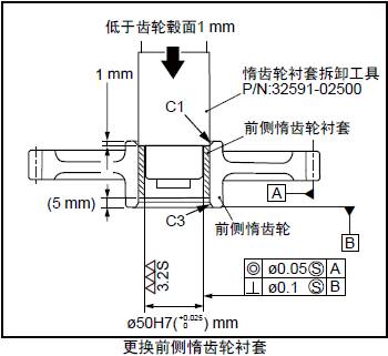 (2) 使用惰齒輪襯套拆卸工具的裝入端,從1mm 倒角的端面壓入,將前惰齒輪襯套壓入至齒輪轂的端面平齊。再用惰齒輪襯套拆卸工具的拆卸端,將襯套端面壓入至低于齒輪轂端面約1mm。