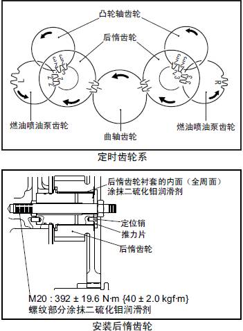測量前側惰齒輪的軸向間隙。超過極限值時,更換新的三菱S12柴油發動機推力片或惰齒輪。