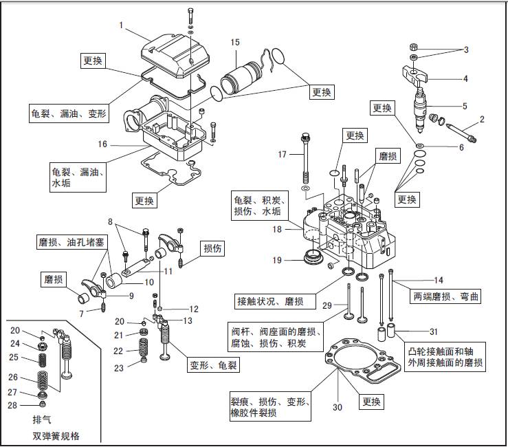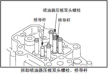 拆卸時參照「三菱R16柴油發動機本體的檢測、修理」的「三菱R16柴油發動機噴油器壓板雙頭螺栓、橋導桿的檢測,更換」項。
