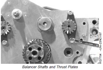 3. Install balancer shafts and thrust plates. Tighten thrust plate cap screws to specifications.