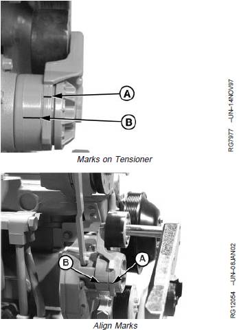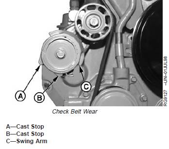 1. Visually inspect cast stops (A and B) on belt tensioner