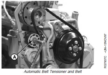 IMPORTANT: Belt tensioner cap screw (A) is left-hand