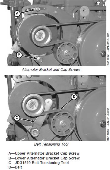 1. Install JDG1341 Belt Tension Gauge (A) on belt,
