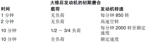 重要提示: 在磨合初期,定時檢查機油壓力和冷卻液溫度。還應該檢查燃油、機油或冷卻液是否有泄漏跡象。一次全負荷運轉時間不能超過 10 分鐘。