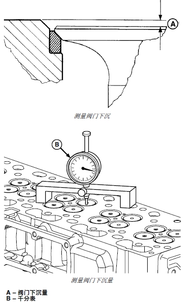 1. 用深度千分表、磁力座千分表或配有 JDG451 高度尺(B) 的千分表測量并記錄閥門下沉量 (A)。測量位置必須從氣門邊緣開始,最多 3.0 毫米(0.12 英寸)。