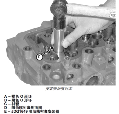4. 將噴油嘴襯套(C) 放在孔口,用 JDG1649 噴油嘴襯套安裝器 (D) 放入襯套中。