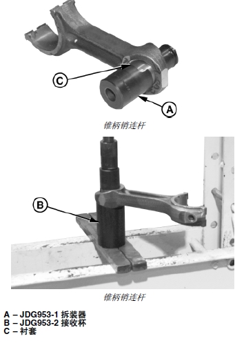 1. 使用 JDG953 連桿襯套保養(yǎng)工具套件的 JDG953-1 拆裝器 (A) 和 JDG953-2 接收杯 (B),拆卸錐柄銷連桿