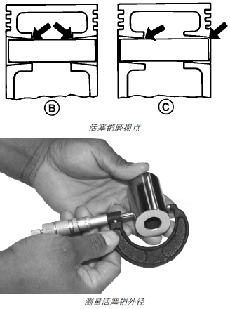 6. 測量活塞銷外徑。如果不符合技術(shù)規(guī)格,應(yīng)更換。