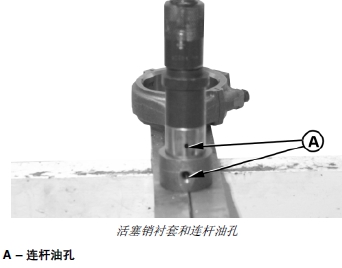 重要提示: 油孔 (A) 必須對準。如果油孔未對準,應(yīng)拆卸襯套并報廢。安裝一個新襯套。襯套不得重復(fù)使用。將襯套裝入連桿。