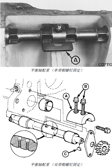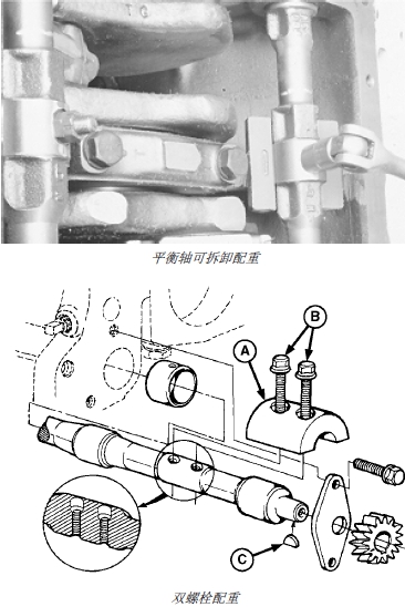 3. 在裝有可拆卸配重 1 (A) 的新式John Deere約翰迪爾強(qiáng)鹿柴油發(fā)動(dòng)機(jī)上,必須拆下配重后才能拆卸平衡軸。