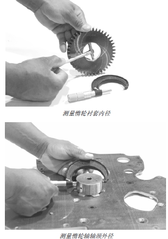 1. 測(cè)量惰輪襯套內(nèi)徑和惰輪軸外徑,確定油隙。如果油隙超過(guò)技術(shù)規(guī)格的要求,應(yīng)更換磨損的零部件。