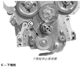2. 如果本章上述測(cè)量過(guò)程中,惰輪軸向間隙不符合技術(shù)規(guī)格的要求,應(yīng)從前板拆下惰輪軸和止推墊圈。(參見(jiàn)本章后面的“拆卸上下惰輪軸”部分。)