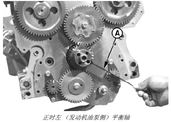 10. 轉(zhuǎn)動(dòng)左(噴油泵一側(cè))平衡軸,使齒輪上的正時(shí)標(biāo)記與 JD254A (JD-254A)1 正時(shí)工具 (A) 對(duì)齊。