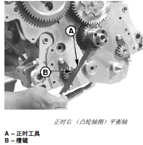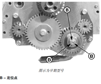 注意: 當(dāng)John Deere約翰迪爾強(qiáng)鹿柴油發(fā)動(dòng)機(jī)鎖定在一號(hào)汽缸活塞壓縮沖程上止點(diǎn)時(shí),平衡軸齒輪上的鍵槽 (B) 必須處在 12 點(diǎn)鐘位置。
