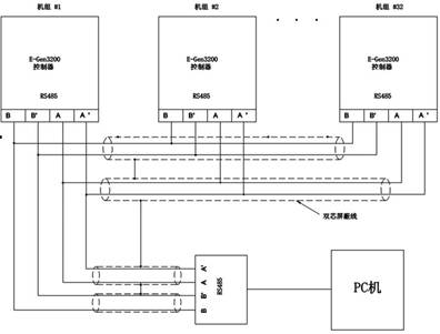并車機組的運行狀況可以由 PC遠程監測,并車機組和 PC間的通信采用 Modbus RS485網絡。Modbus通信協議是公開的;RS-485網絡使用 RS-485通信協議連接線,傳送速度為 9600波特率,無奇偶校驗,有一個停止位,可使用全雙工 /半雙工通訊;計算機端口使用的 RS-232通信協議和 E-Gen3000控制器組成的網絡端口使用的 RS-485通信協議之間需要一個轉換器。該轉換由一外置轉換模塊完成,此模塊將從計算機輸入的 9針 RS-232協議轉換為控制器的 RS-485協議,稱為 RS-232至 RS-485轉換器。在控制器中的聯機示意圖如下: