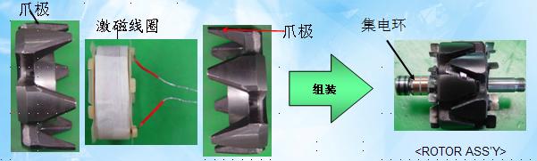 3). 轉子: 激磁線圈兩端各自連接在SLIP RING,依據發動機旋轉并通過刷子收到激磁電流而爪極被磁化(N,S極)使定子里產生交流電流.