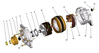 1.螺母  2.彈簧墊圈 3.皮帶輪 4.貫通螺栓 5.限位圈 6.驅動端蓋  7.軸承 8.軸承蓋 9.限位圈   10.轉子 11.定子 12.調節器  13.絕緣套 14.螺母 15.補償套  16.電刷端蓋 17.整流橋 18.螺釘  19.螺釘