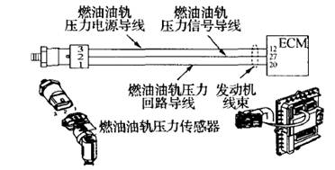 檢修方法是:康明斯筮動機上使用的壓力傳感器大多數為壓電晶體式。壓電晶體式傳感器通過內部的一個壓電晶體來感應壓力的變化,當壓力變化時,作用在壓電晶體上的壓差使壓電晶體輸出一個信號電壓。燃油油軌壓力傳感器就是此種類型,采用三線式,兩根電源線向傳感器提供5v的工作電壓,一根信號線向ECM提供壓力信號電壓,如圖1所示。