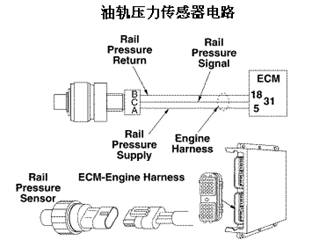 油軌壓力傳感器通過發動機線束向 ECM 提供信號。ECM 利用油軌壓力信號監測從控制閥體輸送到噴油器計量油腔的燃油量。部件位置,油軌壓力傳感器位于控制閥體的右下側。