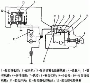 如果齒輪與飛輪齒端相對(duì),不能馬上嚙合,此時(shí)彈簧壓縮,當(dāng)齒輪轉(zhuǎn)過(guò)一個(gè)角度后,齒輪與飛輪迅速嚙合。當(dāng)鐵芯移動(dòng)到使短路開(kāi)關(guān)閉合的位置時(shí),短路線路接通,吸引線圈被短路,失去作用,保持線圈所產(chǎn)生的磁力足以維持鐵芯處于開(kāi)關(guān)吸合的位置。