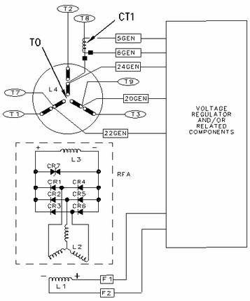 卡特彼勒SR4B 發電機自勵磁發電機配線圖 (CR1-C6) 二級管 (CR7) 變阻器 (L1) 勵磁機磁場(定子) (L2) 勵磁機電樞(轉子) (L3) 主磁場(轉子) (L4) 主電樞(定子) (RFA) 旋轉磁場總成 (CT1) 選裝的電壓降變壓器 (T0、T1、T2、T3、T7、T8、T9) 發電機端子 |