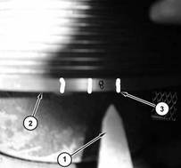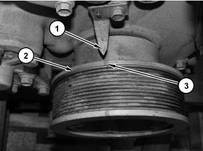 順時(shí)針緩慢轉(zhuǎn)動曲軸,使在步驟8中作的減振器或皮帶輪(2)上的標(biāo)記與指針(1)的尖部對齊。此時(shí)1號活塞位于壓縮沖程上止點(diǎn)。參考圖2和圖3。