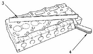 測量卡特彼勒3064/6發動機缸蓋的平直度。利用直尺(3)和塞規(4)測量平直度。