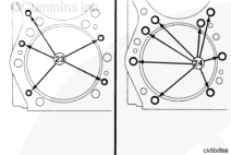 對缸體進行了改動以便能夠安裝較長的缸蓋螺釘。以前的康明斯發動機必須使用長度為 171 mm [6.73 in] 的螺釘。現在的康明斯發動機必須使用長度為 203 mm [8.00 in] 的螺釘。短螺釘可用于維修。這些螺釘都是鍍鎘的(銀色或金色)。必須將這些短螺釘擰緊至 353 N•m [260 ft-lb]。如果短螺釘表面具有 lubrite 鍍層,而且顏色是黑色,則必須予以更換。203 mm [8 in] 螺釘只能使用 lubrite 鍍層。555 N•m [409 ft-lb] 扭矩必須施加在這些螺釘上。K50 康明斯發動機總是使用 203 mm [8.00 in] 螺釘。