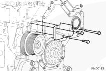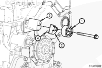 利用導(dǎo)向適配器上的定位銷(4)(如果配備),將惰輪皮帶輪(1)和導(dǎo)向適配器(2)軸與皮帶張緊輪支架(3)對正。使用一個(gè)墊圈和螺栓,將皮帶惰輪皮帶輪和軸安裝在皮帶惰輪支架上。擰緊螺栓。扭矩值: 30 n.m [25 ft-lb]。安裝防塵密封圈。