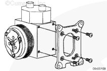 在制冷劑壓縮機(jī)上安裝制冷劑壓縮機(jī)安裝支架。制冷劑壓縮機(jī)固定在支架凸緣的頂部。安裝 4 根安裝螺栓和制冷劑壓縮機(jī)支架。擰緊螺栓。