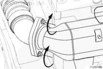 在 V 形帶箍的內(nèi)側(cè)涂一層高溫防粘結(jié)復(fù)合劑,以確保對帶箍適當(dāng)加載。在排氣歧管前部安裝 v 形帶箍。在與排氣歧管前部分連接的 EGR 冷卻器導(dǎo)引端安裝一個(gè)新的密封墊。將 EGR 冷卻器裝到機(jī)油冷卻器總成的雙頭螺柱上。