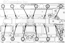 使用清潔的發(fā)動(dòng)機(jī)機(jī)油潤滑所有水泵螺栓的螺紋和螺栓端頭底部。將水泵裝到康明斯ISX和QSX15發(fā)動(dòng)機(jī)上。安裝并用手指擰緊底部的兩個(gè)螺栓。