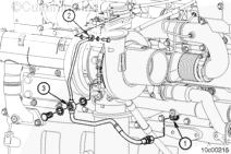 將渦輪增壓器冷卻液供應(yīng)軟管安裝到機油濾清器座 (1) 上。