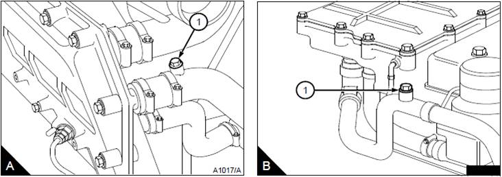 3對于裝配中冷器的發(fā)動機(jī):打開垂直中冷器的放氣螺釘(A1)或水平中冷器的放氣螺釘(B1)。這將確保從中冷器中排出所有冷卻液。