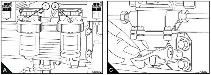 1松開粗濾器(A2)的濾清器座上的放氣旋塞。操作燃油輸油泵(B)的注油桿,直到排出從放氣旋塞進(jìn)入燃