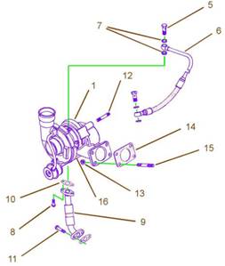 注:回油管組件(9)上法蘭需用6mm調整螺釘(8)固定到渦輪增壓器(1)上?;赜凸芙M件(9)下法蘭需用8mm調整螺釘(11)固定到缸體上。