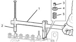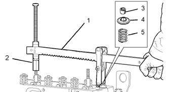 3.將氣門彈簧壓縮器(1)在缸蓋上安裝入位,以壓縮相關氣門彈簧(5)。壓縮氣門彈簧(5)。