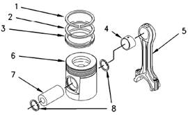 1.用一個合適的活塞環(huán)擴張器從活塞(6)上拆下活塞環(huán)(1)和(2)及控油環(huán)(3)。從連桿蓋上拆下連桿下軸瓦。從連桿上拆下連桿軸承上軸瓦。