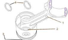 3.將連桿的標記(1)與活塞的凸臺切口(2)對齊。還要檢查確認活塞頂部標記的箭頭(3)對齊。將活塞銷安裝到活塞中并穿過連桿。