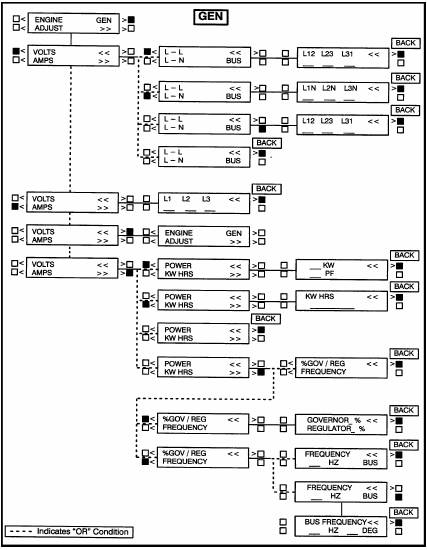 >”旁的按鍵將進到調速器/調壓器/頻率(%GOV/REG/FREQUENCY)子功能。選擇%GOV/REG(調速器/調壓器)以最大值的百分數顯示調壓器和調速器的調節開度;選擇FREQUENCY(頻率)顯示發電機的輸出頻率、母排頻率或系統的同步信息。在顯示調壓器/調速器或頻率參數的狀態下,按“<<”旁的按鍵顯示屏將回到(“BACK”)調速器/調壓器/頻率(%GOV/REG/FREQUENCY)子功能。