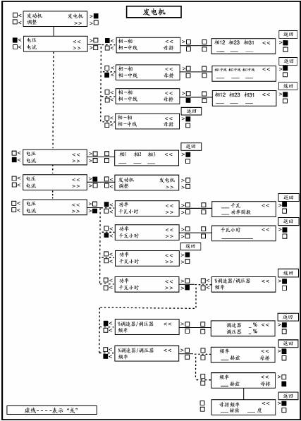 如果需要顯示發電機參數,如電壓、電流、輸出功率(千瓦)和頻率,按顯示屏上“GEN”附近的按鍵,通過此功能分支還可以查看母排電壓、頻率和數字式同步信息。參考本章GENMENU(發電機功能)。如果需要調整輸出電壓、頻率或起動和停機延時等,按顯示屏上“ADJUST”(調整)附近的按鍵,參考第5章“ADJUSTMENU”(調整功能)。