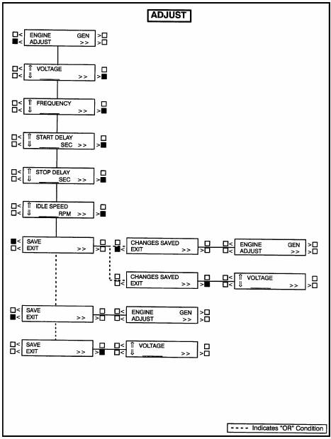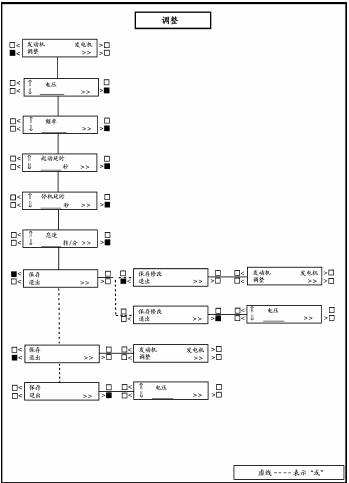 調整(ADJUST)子功能允許對發電機組輸出電壓、頻率、起動和停機延時進行調整。