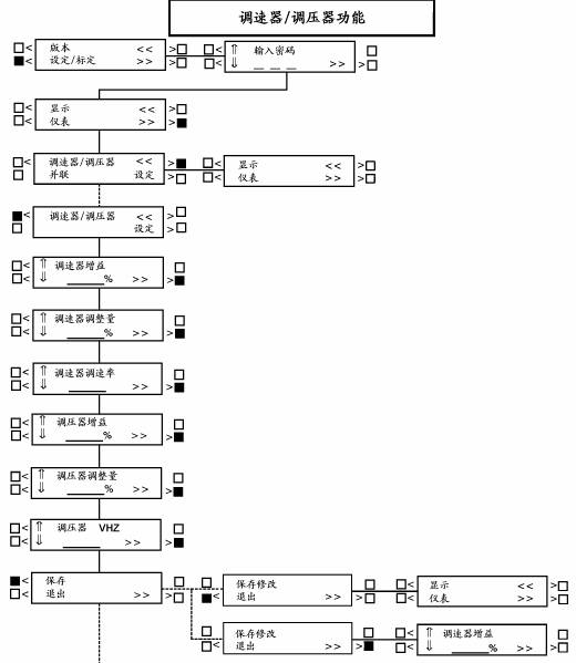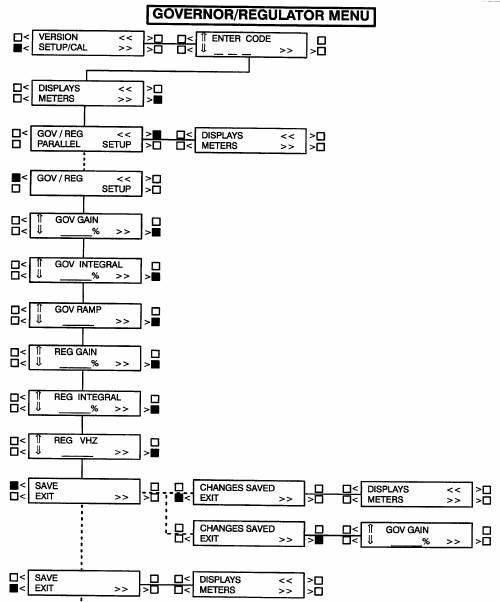 下一頁為調速器/調壓器(GOV/REG)子功能的方框圖,這是4項設定/標定(SETUP/CAL)功能中的第3項子功能。如果按主功能中“>>”符號旁邊的按鍵,將顯示版本/設定/標定(VERSION/SETUP/CAL)子功能。