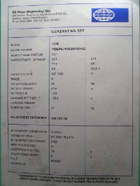 每一臺(tái)柴油發(fā)電機(jī)組都有一個(gè)銘牌,它被粘貼在主交流發(fā)電機(jī)的外殼上或機(jī)組控制屏的背后。銘牌上的資料用于鑒別該機(jī)組的型號(hào)、編號(hào)及簡(jiǎn)單技術(shù)特性,如額定轉(zhuǎn)速、額定電壓、電流和額定頻率、額定功率、額定功率因數(shù)及機(jī)組的標(biāo)準(zhǔn)測(cè)試條件如環(huán)境溫度和海拔高度等。為了向用戶提供更詳細(xì)參考,一些資料還會(huì)重復(fù)在隨本手冊(cè)附送的技術(shù)數(shù)據(jù)表內(nèi)。 |