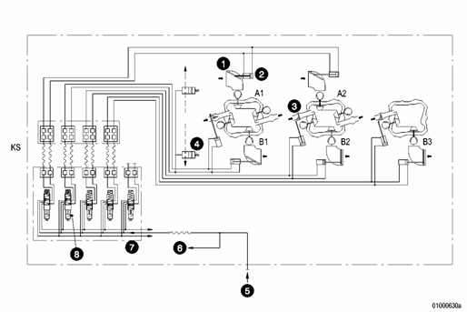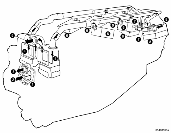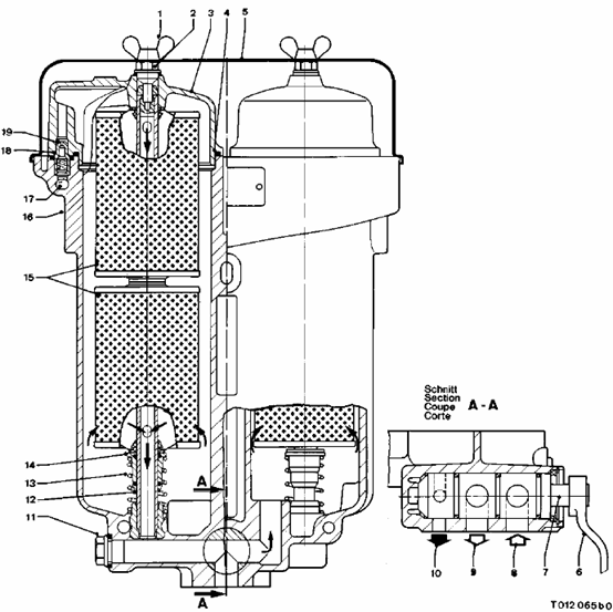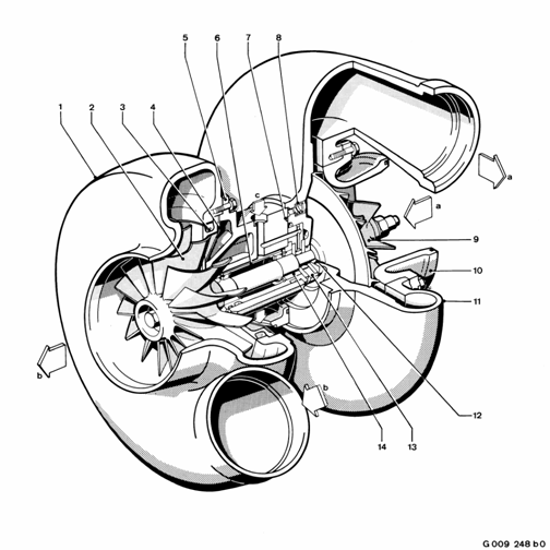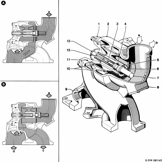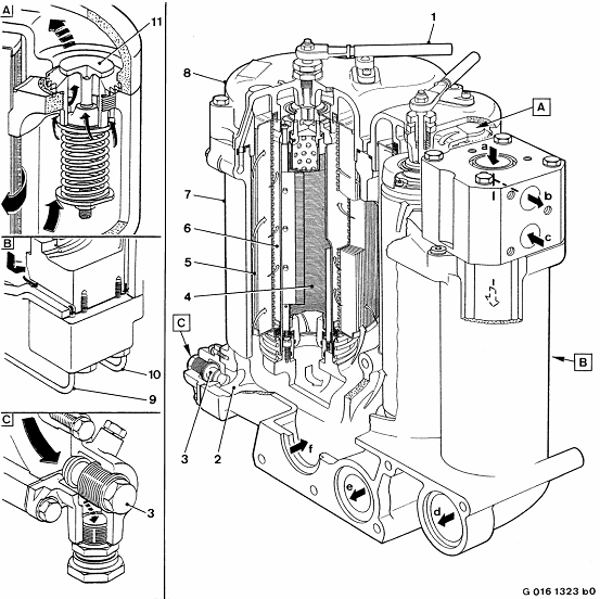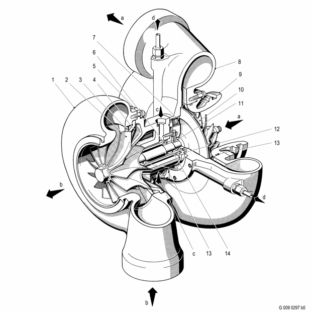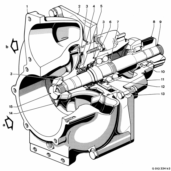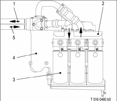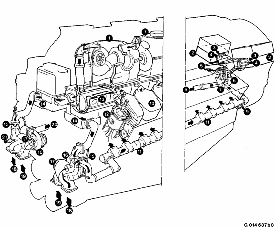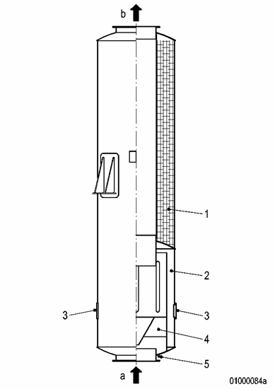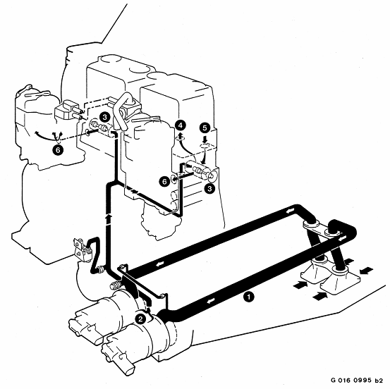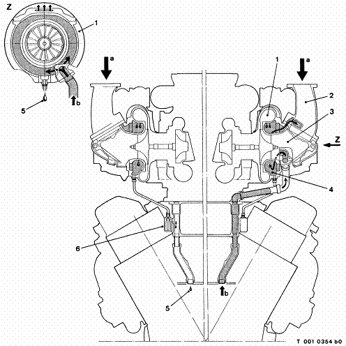 描述:曲軸箱呼吸器與壓氣機的進氣相連,在曲軸箱內形成微負壓,壓氣機把油氣混合氣體從曲軸箱的吸入管線b處吸到進氣氣室和壓縮空氣氣室之間的凝結機構中,混合氣中的油粒子會被分離到凝結機構中冷凝,凝結后的油通過回油管道(虹吸管)送回到曲軸箱中。