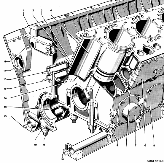 曲軸箱是柴油機的基礎,由固定在機身內部的傳動齒輪機構、輔助安全裝置、缸頭、機身等組成,為了保證機身的穩定,曲軸箱被布置在曲軸中心線以下。左右兩側汽缸中心線成60度布置。曲軸箱與廢氣渦輪增壓器的進氣管線相連,以轉移從活塞環中竄入曲軸箱內的氣體。軸承蓋被橫向和縱向的螺栓緊固在曲軸橫斷面處,曲軸安裝在軸承上,每側兩根鋼制管道是機體內的主冷卻15和潤滑16油通道,而用以冷卻活塞的噴嘴被螺釘固定在潤滑油管道15的底部。為了檢查運動部件的狀態,在機身的兩側設計了觀察孔門5,其中AB兩側各設置兩個防爆孔門7,以防止曲軸箱超壓。凸輪軸安置在曲軸箱的17位置,齒輪系安裝在柴油機自由端,在機身最底部的是承油盤,它為柴油機的運行提供其所需的潤滑油。