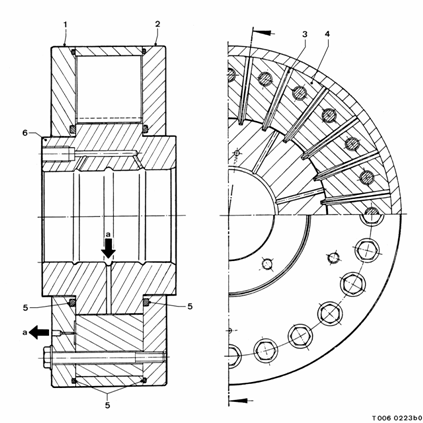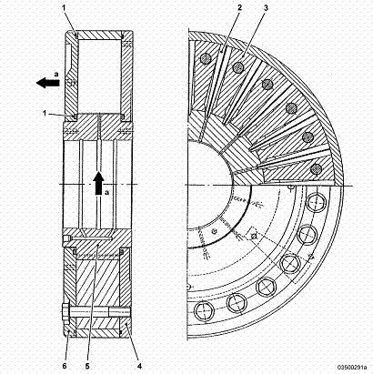 描述:減震器的作用是通過彈簧片的變形來增加阻尼,用以平衡曲軸的扭矩。曲軸的扭矩和振動都是通過彈簧片進行衰減的。減震器的中心星形支架與外部構件通過板簧連接,彈簧片的一部分被緊緊的夾在中間構件內部,還有一部分被插在星形架上沿軸向分布的凹槽內。彈簧片與內部構件間形成了油腔,在柴油機運行期間,減震器內存在潤滑油壓。潤滑油通過曲軸油道進入減震器內,然后回流至曲軸箱承油盤。當有扭矩或振動傳遞時,彈簧片變形,彈簧片的內外圈間產生相對運動,致使彈簧片與內部構件間的油室空間發生波動,油室內的潤滑油受擠壓從端蓋上的油孔排出,這樣內外圈間的相對運動就會被阻滯,扭矩或振動就被衰減消除了。內部構件限制了彈簧片的形變量,因此減震器可以在短時間內消除曲軸扭矩及振動。