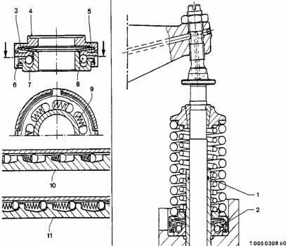 描述:下彈簧座的作用除了支持彈簧外,主要是旋轉氣閥,避免氣閥受熱不均或閥座積碳。該彈簧座由帶凹槽的環形座體以及彈簧、鋼珠、壓蓋等組成。在座體內的每個凹槽內布置有一個鋼珠,當閥門關時,鋼珠被凹槽內的彈簧頂在凹槽最高位置(如11),一個內凹的蝶形墊圈安裝在環形座體與壓蓋之間,由壓蓋將彈簧的形變傳遞到蝶形墊圈上。