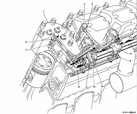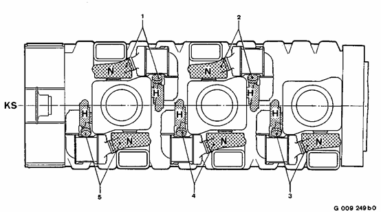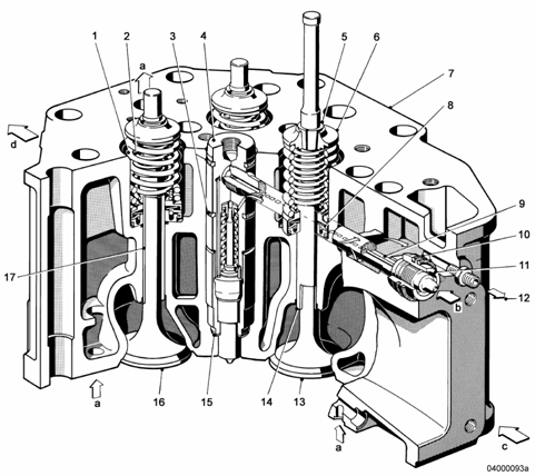 描述:分體式缸頭被螺栓緊固在曲軸箱上,曲軸箱與缸頭間由銅墊片進行密封, 油路和冷卻水路又由橡膠密封圈進行密封,缸頭上表面由缸蓋進行密封,每個缸頭上有兩個進氣閥和兩個排氣閥分布在噴油器的周圍,進氣閥和排氣閥安裝在下彈簧座上,噴油器安裝在氣閥中間的孔內,與缸頭油道間用密封環進行密封。每個缸頭都有一個減壓閥,每一側活塞組布置一個啟動空氣分配器。