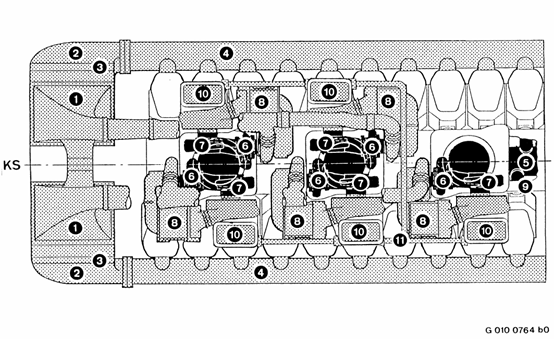 10 去主潤滑油泵                           b 缸頭冷卻水